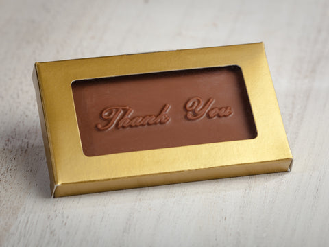 These Chocolate Bars are packaged in a window box to clearly display your chocolate greeting with a place on the back to attach your Business Card. Cocoa Mill's Chocolate Greeting Bars are convenient to share with clients, business acquaintances, friends, and friends alike.